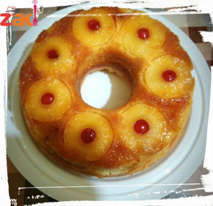 تدهن الئالب ونحط كاسة سكر على نار هادئة ليدوب السكر ويصير لونه بني فاتح او ممكن بعد ماتدهني الئالب بالزبدة ترشيح سكر بني بدل الكراميل وبعدها نصف الاناناس بالئالب و نحط كرز اذا موجود ومنحضر الكيكة