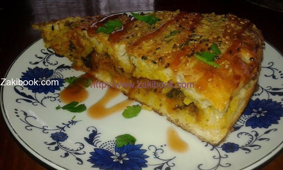 – بعدما خمرت العجينة قسمتها نصين, و فردت النص الاول بصينية الخبز و رشيت الحشوة فوقه وبعدين فردت النص التاني و طبقت النصين ع بعض.