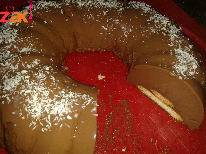 في صينية نضع طبقتين من البسكويت ونصب خليط الموكا فوقها، نتركها في الثلاجة لتبرد مدة 4 ساعات.