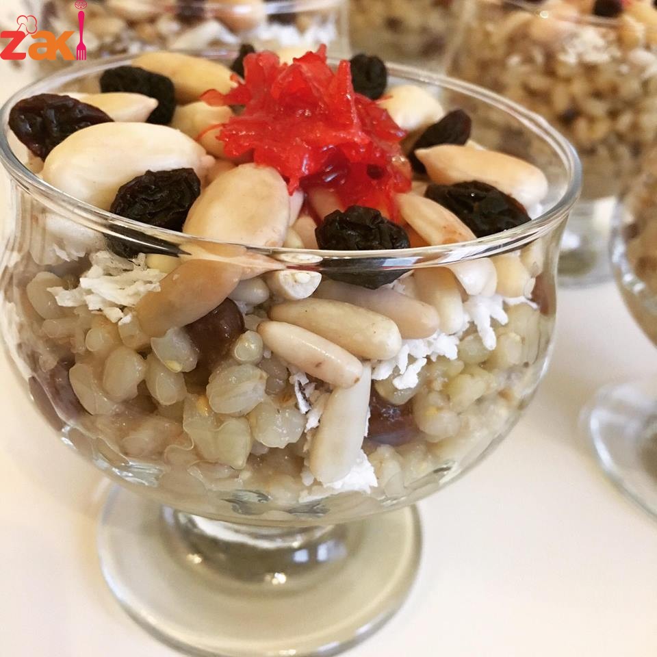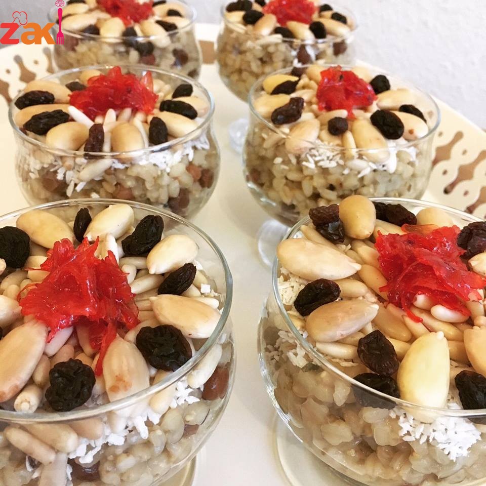 يغسل القمح ونضعه على النار مع ماء ويانسون وسكر حسب الرغبه ويغلى حتى تنضج الحبه ثم نضع القليل من الزبيب في المرحله النهائيه من الغلي ، يصب في الكاسات ويزين حسب الرغبه يأكل ساخن قليلا او بارد وفي الجهتين طيب .
