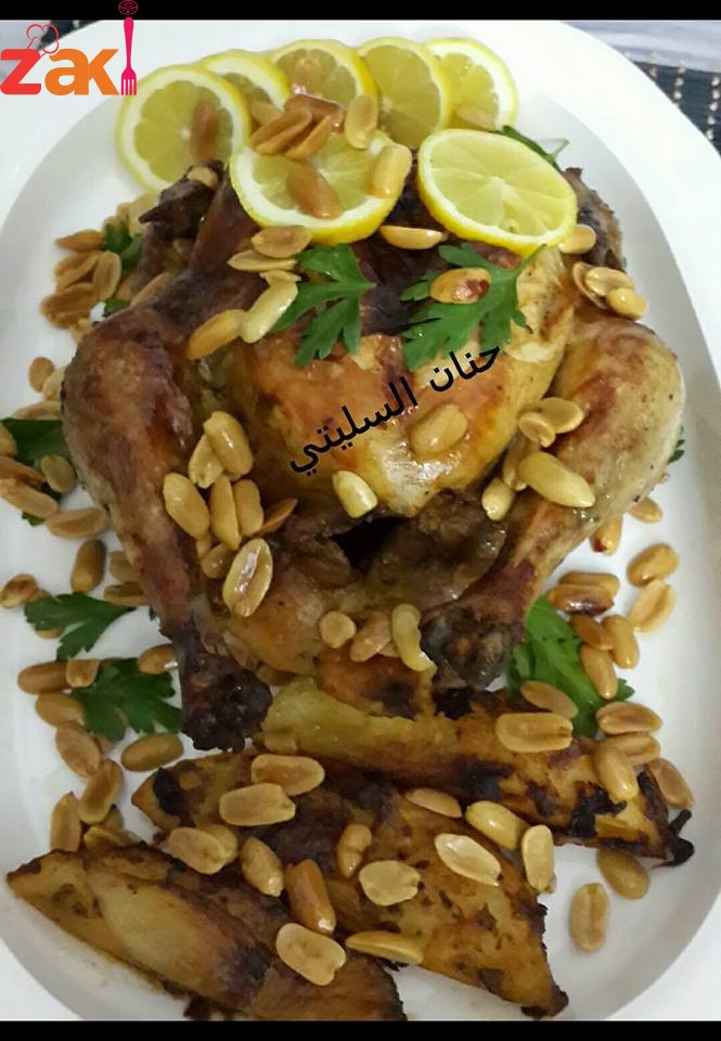 منتبل الجاجه فيهم قبل بيوم او مننقعها 3 ساعات وبعد هيك منحط الدجاجه في كيس الشواء وبالفرن من تحت على درجة حرارة متوسطة لمدة ساعتين ومن نفس الخلطه الي نقعنا فيها الجاجه منحطهم على شرائح البصل والبطاطا وايضا بكيس الشواء وبالفرن وبس انخلصها منشيلها من كيس الشواء ومنحمرها على الوجهين .