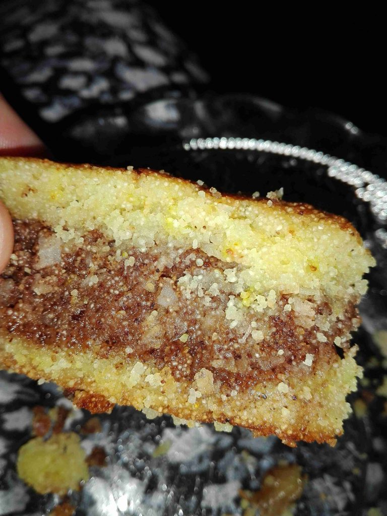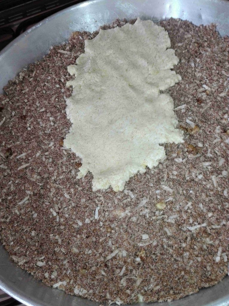 بعد هيك بنحضر الحشوة (بنخلط كل المكونات مع بعض) وبنفرد الحشوة فوق العجينة