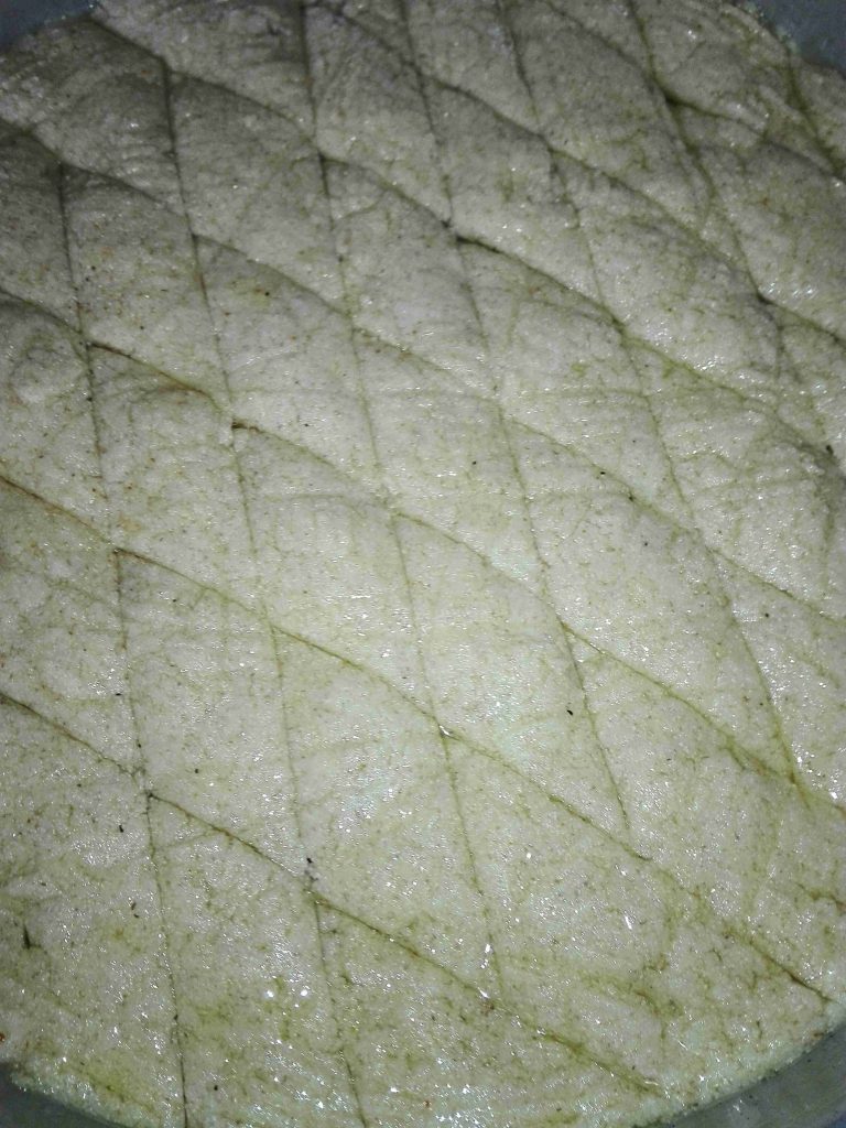 واخر شي بنفرد اخر طبقة واللي هي نص العجينة اللي بقيت عنا .. بنقشها بشوكة او ملقط المعمول بعدين بنقطعها وبنخليها ترتاح ربع ساعة