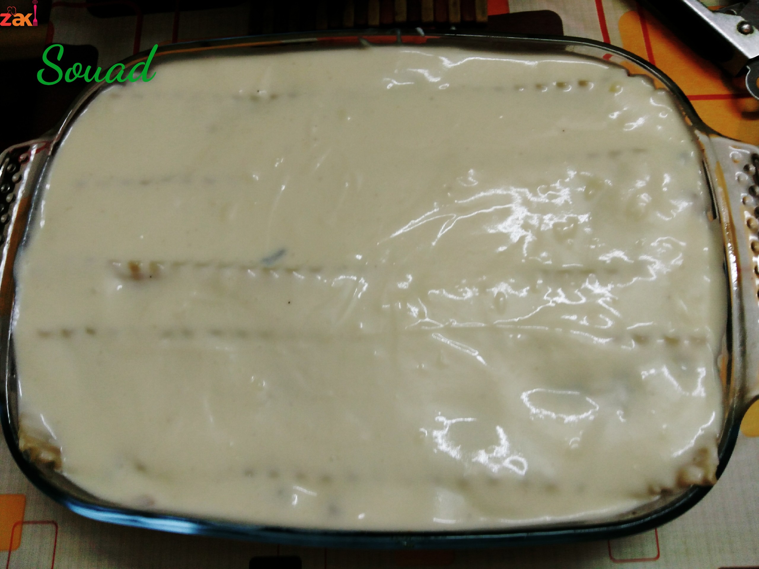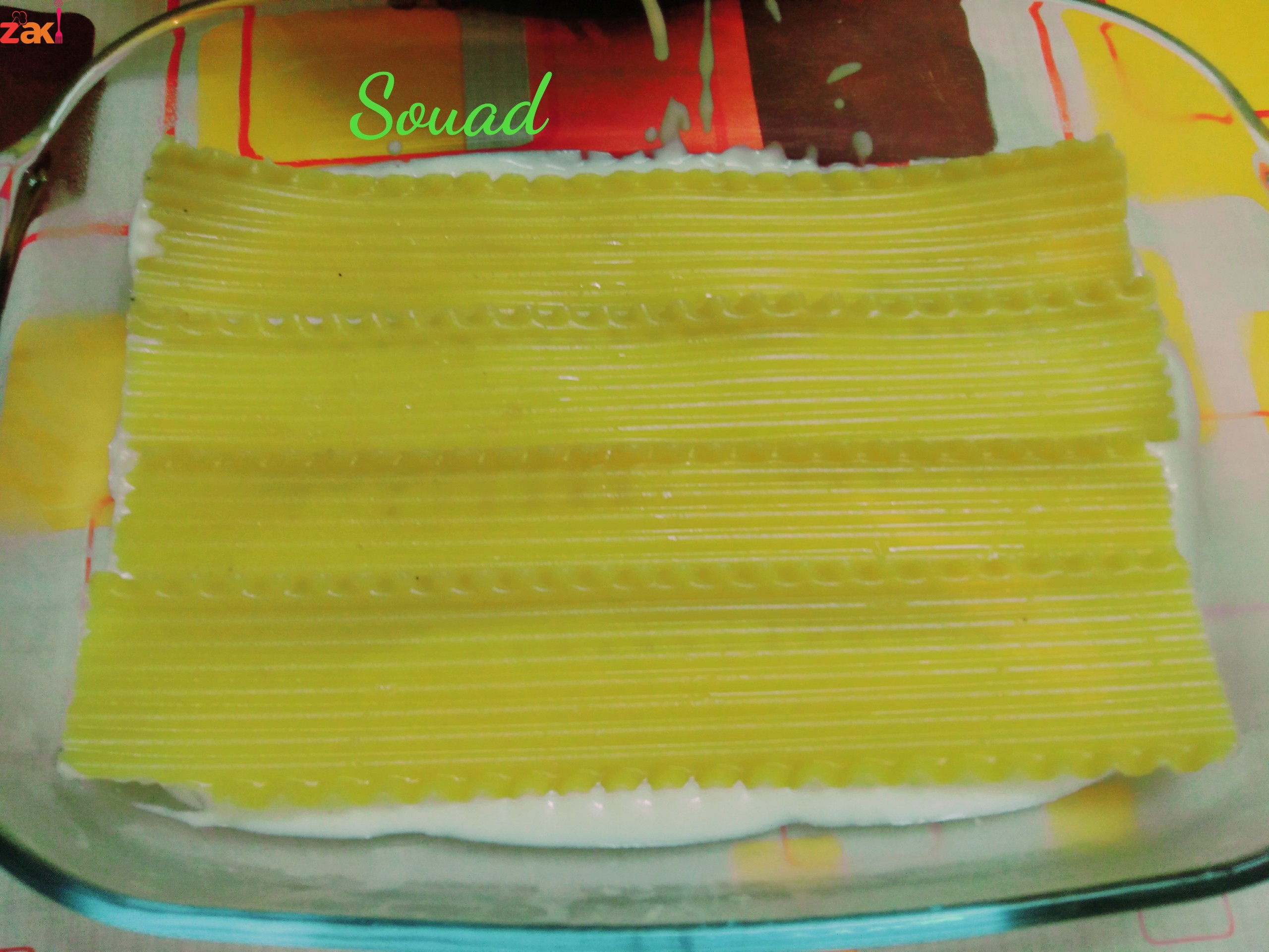القاع ثم نضع قطع اللازانيا (حوالي ال٥قطع) ثم