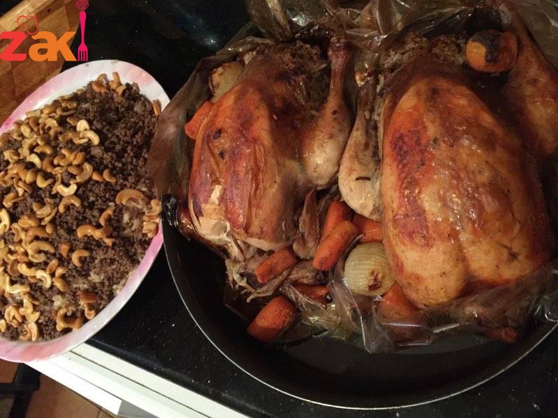 نأتي بطنجرة و نقلي اللحمة المفرومةو عندما تقترب للاستواء نبهر بالسبع بهارات و القرفة و نضيف اليهم الارز بعد تنقيته و غسله و نزيد على الارز سبع بهارات و رشة هيل و رشة جوزة الطيب و ملح و نقلبهم و نضيف لهم كوب ماء مقابل كوب و نصف ارز ( نصف استوى ) بعد ان يبرد الارز يحشى به بالدجاج و يوضع داخله ورق الغار ثم يخيط او ( توضع عودة خشب الاسنان او اثنان يسكر بها الفروج بدل الخيط) و لاحمرار الفروج ممكن دهنه خارجا باللبن و يوضع جانبه جزر و رؤوس بصل ثم يوضعوا في الكيس الخاص للفروج و يغلق بربطة الكيس