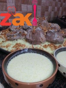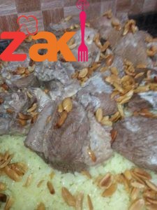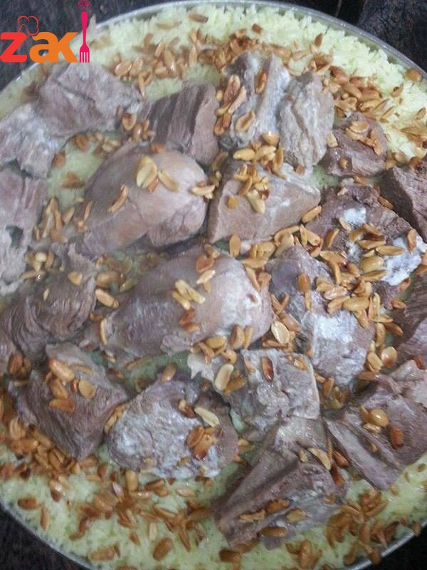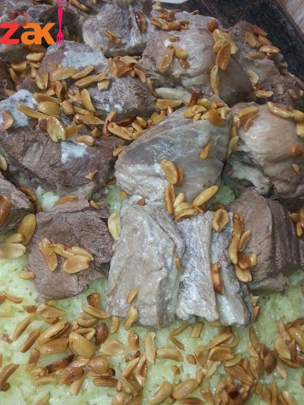 بعدا بتشيلي لحم وبتحطي يغلي بلبن بباخد نكهه اطيب وبتجهزي لشراك بجاط التقديم وبتنقعي بلبن وفوئو الأرز وبعدا بتحطي لحمه وبتحطي لمكسرات الي بتحبوهن