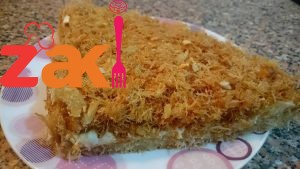 بتجيبي نص كيلو كنافة وتقطع قطع صغيرة وتضيفي عليها نصف كوب سكر بودر ونصف كوب سمن سخنة وتقلبيهم مع بعض، ، نضع كمية صغيرة في صواني الكب كيك وتضغطي عليهم كويس وتدخليهم الفرن وفور حروجها تضعي ملعقة سيرب (شربات) وتضعي ملعقة كريمة وتضعي عليها قطعة اخرة تكون عليها سيرب بس