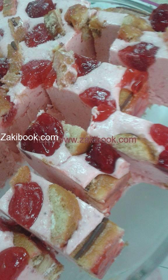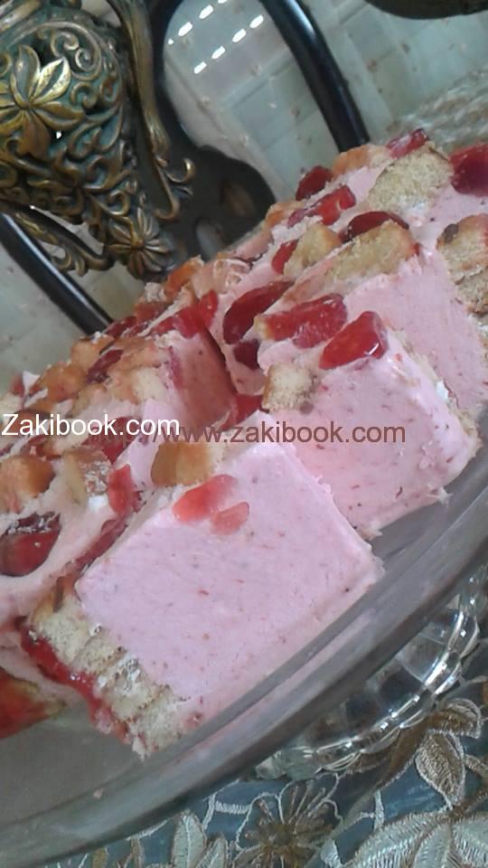 – توضع البوظه في القالب تزين بباقي علبة الفراوله وكيك السويسرول.