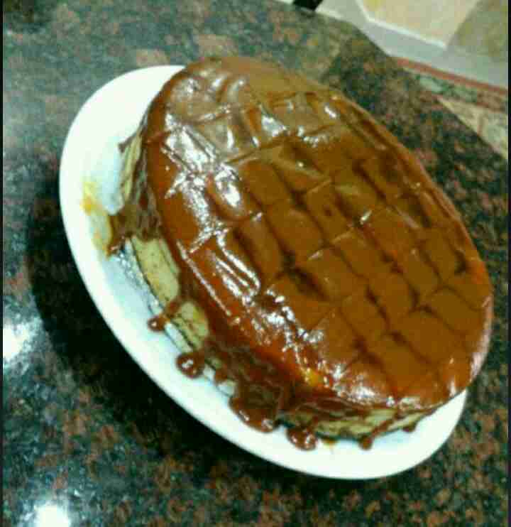 نضع قدر عالنار ونضع فيه الحليب والسكر والزيت ونحرك ونستمر بالتحريك الى ان يصبح لونها اشقر من ثم نضيف الماء والكريم كرامل ونحركها ومن ثم نبعدها عن النار ونضع هذا الصوص عالكيكة