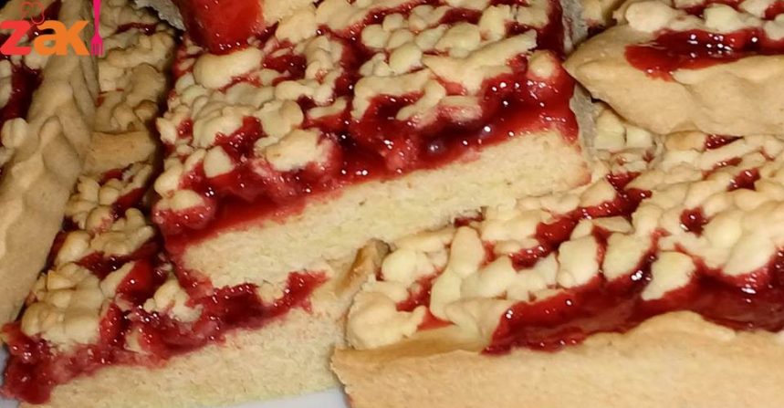 - ثم نضع المربى وبواسطة مبشرة نبشر النصف الباقى على الوجة بالتساوى تدخل القالب التلاجة لمدة ربع ساعة ثم تخرج من التلاجة وتدخل فرن حامى مسبقا على نار وسط
