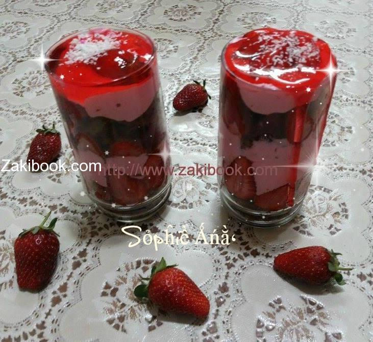 – ظرف جيلي ع فراولة بتذوبيه بنص كاسة مي و بتصبيه, بيعطي طبقة رقيقة, واذا بتحبي حطي ظرفين عشان يعطي طبقة أكثر سُمكاً.