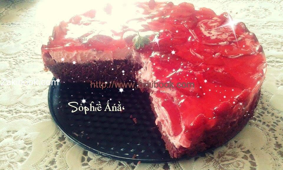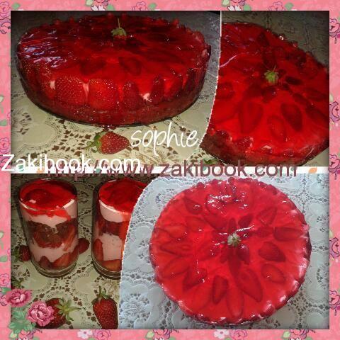 – أي كيكة بتتقنيها على شوكولاته سواء عادية أو اسفنجية, بتقسميها من النص وبتشربيها شربات او عصير فراولة او اي صوص بتحبيه, وبتحطي فوقه شرائح فراولة.