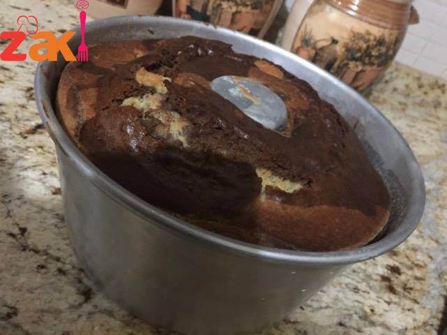 6. ضعي مغرفة من العجين الأبيض في منتصف الصينية ثم مغرفة من عجين الكاكاو فوقها وهكذا بالتبادل حتى تنتهي من العجين.