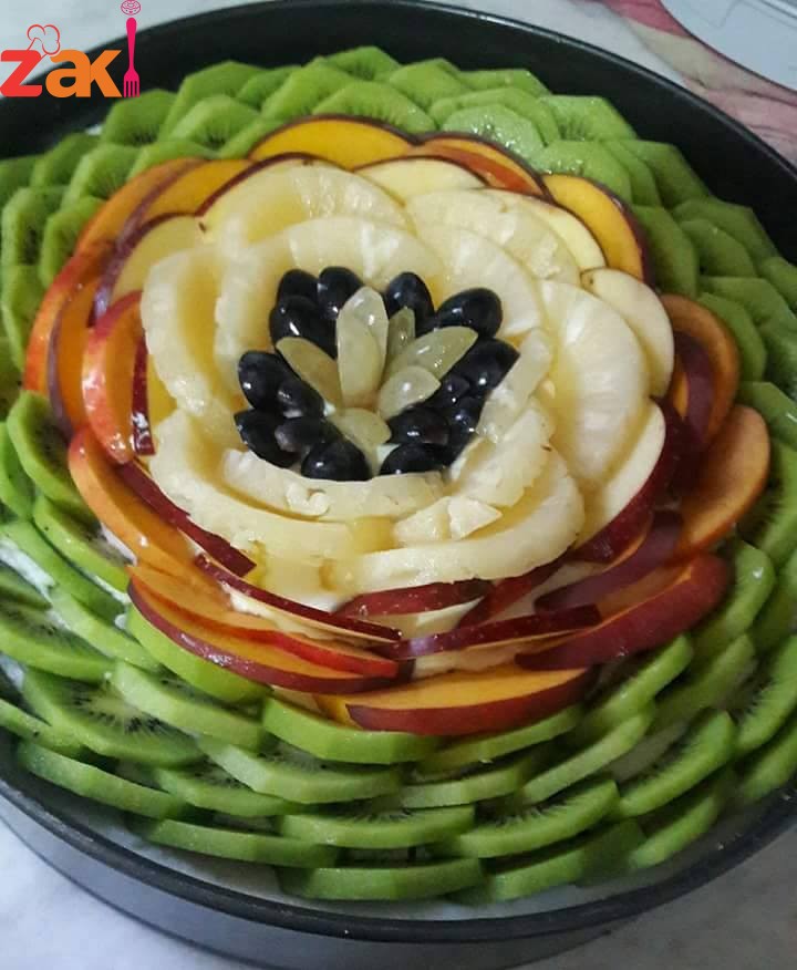 نخفق الكريما لحتى تصير كثيفة بعدين بنحط القشطة والكيري والسكر وبنخفق مليح وبعدين بدوب الجيلاتين بماء مغلية وبصبهن فوق الخلطة وبحطهن فوق البسكويت وعلى البراد لحتى تبرد مليح وبزين بالفواكه