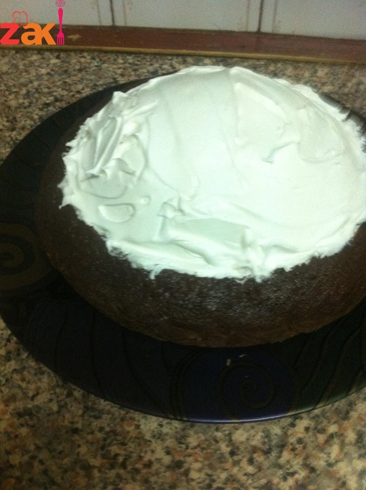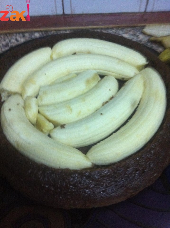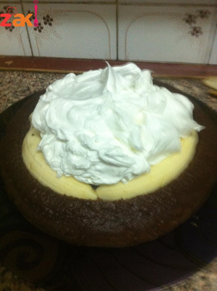 خلط المقادير زي اي كيكه وخبزها بالفرن وبعد ما تبرد نفرغ وسط الكيكه ونضع الموز بالترتيب لحتى نغطي الفراغ ونحضر الكريمه ٢ ظرف ونخفقهم بكوب حليب ونضعها على الموز ونضع فتات الكيك اللي شلناه من الوسط وتوضع في الثلاجه حتى تبرد وتقدم وصحه وهنا
