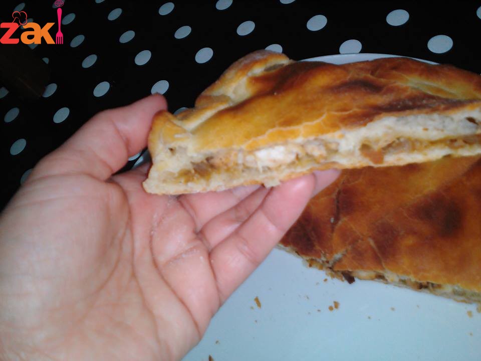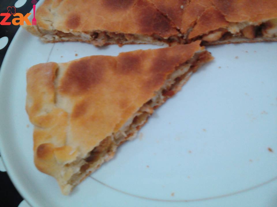 انا حشوتي كانت التالية بصلة مقطعة مربعات نحطها في مقلة تتشوح مع شوية زيت ثم نضيف حبة جزر مسكرفجة اي مبشورة صدر الدجاج مقطع مربعات فلفل اسود و ملح حتى تطيب اي تنضج نقسم العجينة على اثنين وحدة اكبر شوية نسبق فيها نحلها دائرة و نحطها في المول او صينية الخبز يعني نحط عليها الحشو و نحل العجينة الثانية و نحطها من فوق و ع الفرن يكون ساخن