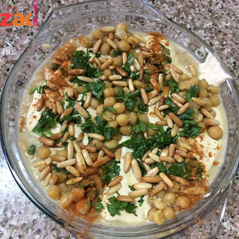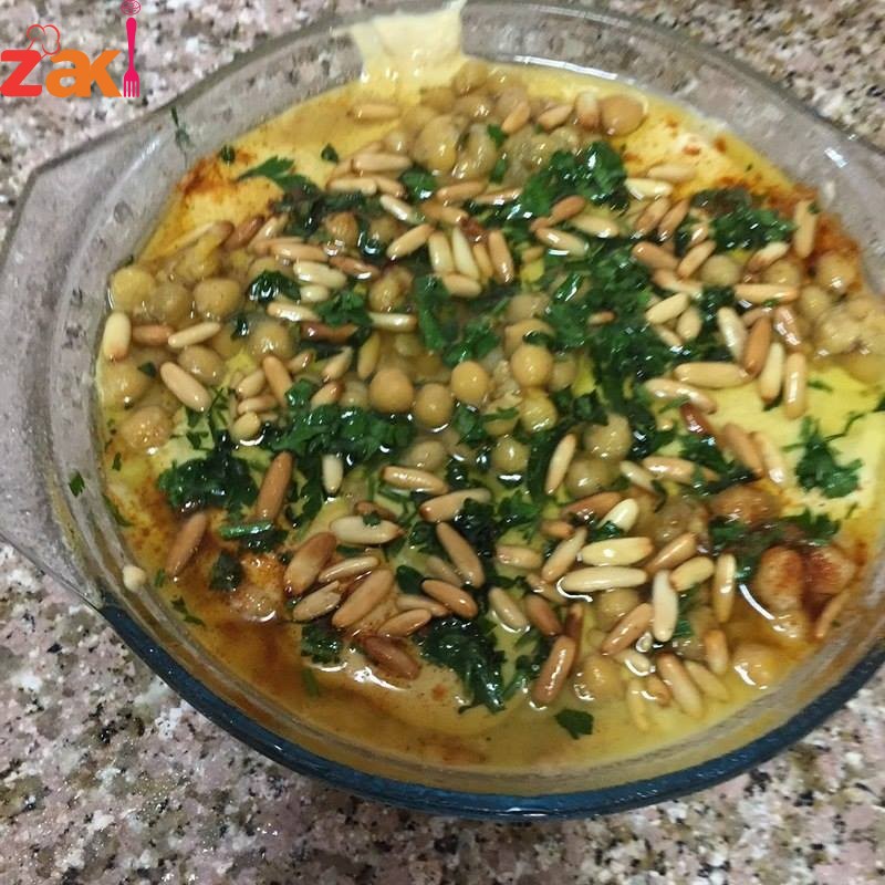 ونخلطهم جيدا ونضعهم فوق الحمص والخبز ثم نحمر صنوبر بملعقتين سمنه ونضعهم فوقهم ونزينه بحب الحمص المسلوق وشوية بقدونس