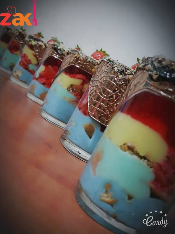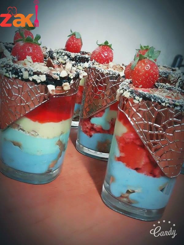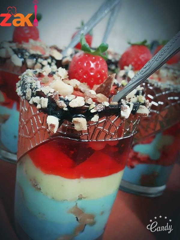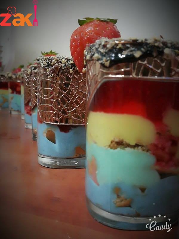 لكل طبقه ملونه يلزم كوب حليب 2 ملعقة كبيرة نشا 1 ملعقة قشطه 1 ملعقة سكر ملعقة صغيرة ماء ورد 3 نقاط من ملون الطعام يخلط جيدا ع الغاز حتى يتماسك بكاسات الحلى منكون مقطعين البسكويت ومنضيف الحلا ثم بسكويت ثم طبقه اخرى وبنفس المقادير ولكن ملون طعام مختلف في كل مرة