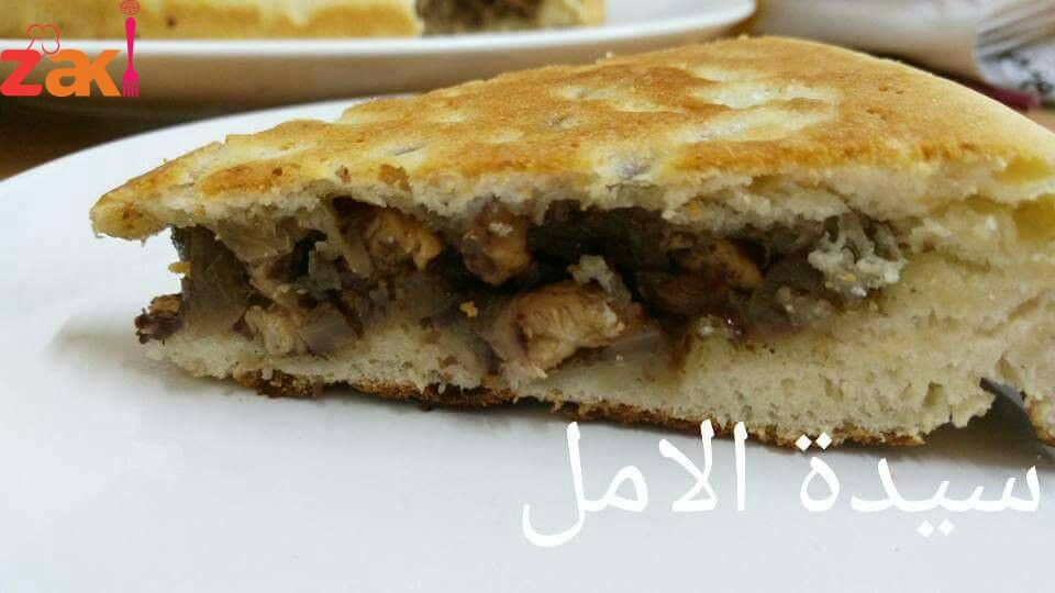 ندهن صينيه بالزيت ونمد الجزء الاول من العجينة ثم نضيف الحشوة وفوقها الجزء الثاني من العجينة ثم ندهن وجهها بقليل من زيت الزيتون وندخلها الفرن حتى تنضج ثم تقطع وتقدم