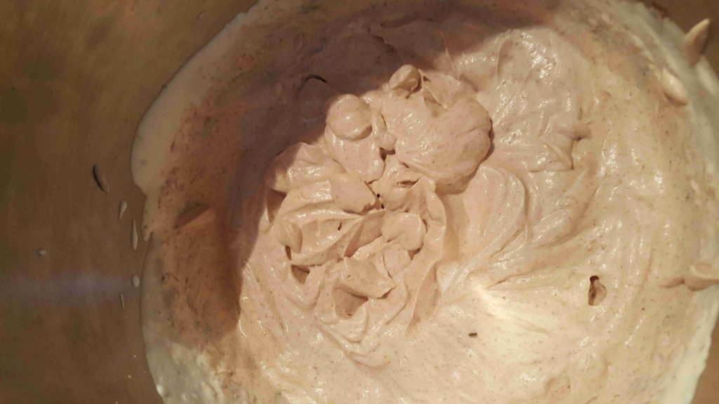 بهي الاثناء منخفق الكريما لحتي تتماسك بعدا منضيف عليها الشكولا ومنخفق بسرعه لتختلط كل الموكونات منيح واخر شي منحط الجبنه ومنخفق بسرعه لتختلط لاتبالغوا بالخفق مشان ماتفصل الكريمه