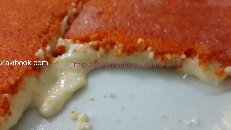 – نخرج الكنافة من الفرن, ونقلبها في وعاء أخر لكي تصبح طبقة الكنافة في الاعلى وطبقة الحشوة في الاسفل.