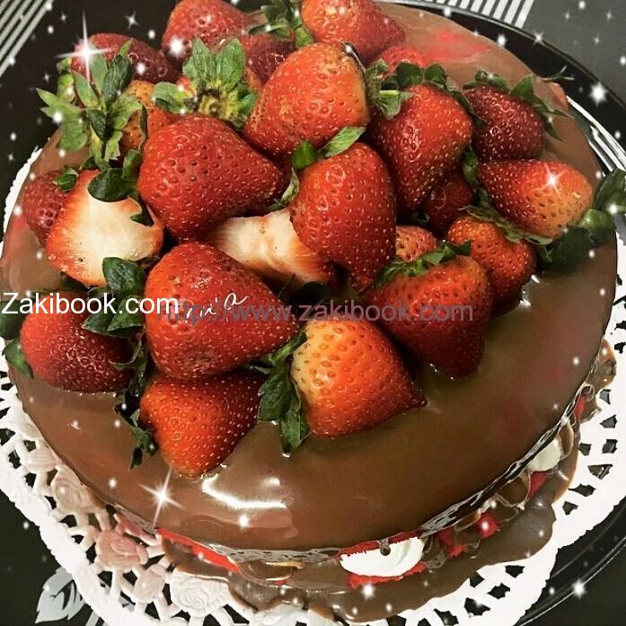 – عملت شوكولا ألواح حطيتها بحمام مائي مع نص كوب كريما سائله مع ربع أصبع زبده حركتهم منيح حتى ذابت زينت فيها الكيكه ومن فوق حطيت فراوله ودهنت وجه الفراوله جيلو فراوله مداب بماء ساخن..والف صحه.