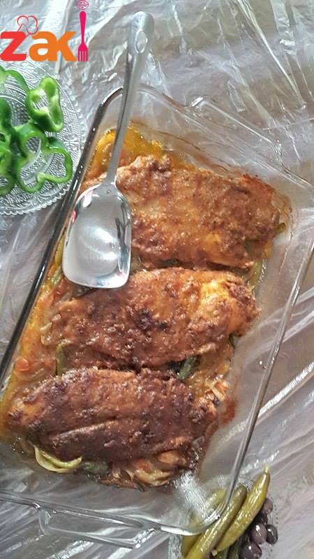 قالب السمك ( الفيليه ) مع القرشله و الفلفل الملون بالفرن