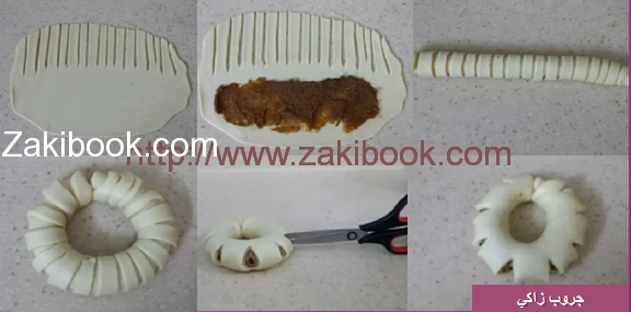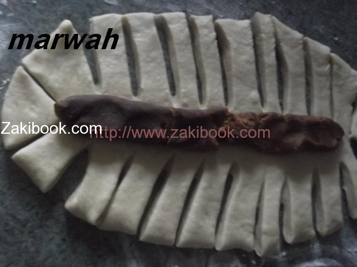 اول شي افردي العجينة مستطيل و اعملي التمر المعجون ع شكل اسطواني و حطيه عالعجينة و لفيها عليه و بعدين شرحيها بس شوي بدون ما تقطعيها لقطع و بعدين وصلي الطرفين ببعض و ادهنيها ببيض بس و رشه سمسم و اخبزيها هيك الشرحات اللي عملتيها بتنفتح شوي و بصير شكلها هيك.