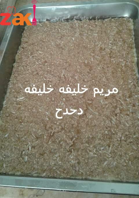 - ويتم خلطهم معا ثم بجيب صينيه مدهونه بالزيت ثم بحط نصف كمية العجينه بأسفل الصينيه ثم بسكب الحشوه