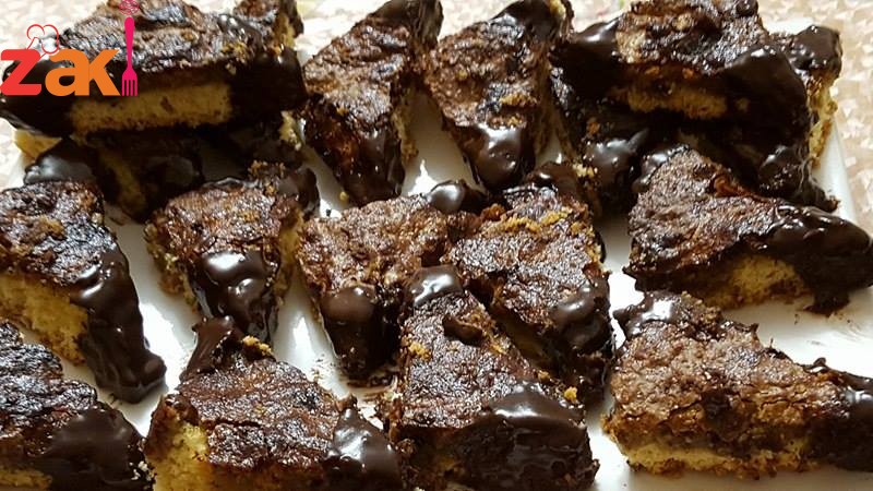 • ثم نخرجها ونتركها تبرد تماما ونقطعها بالطول ثم بالعرض تصبح مربعات نقسم المربع إلى مثلثات ونكون مذوبين شوكلاته نضع أطراف المثلث بالشوكلاته ونتركه حتى تجف وتقدم