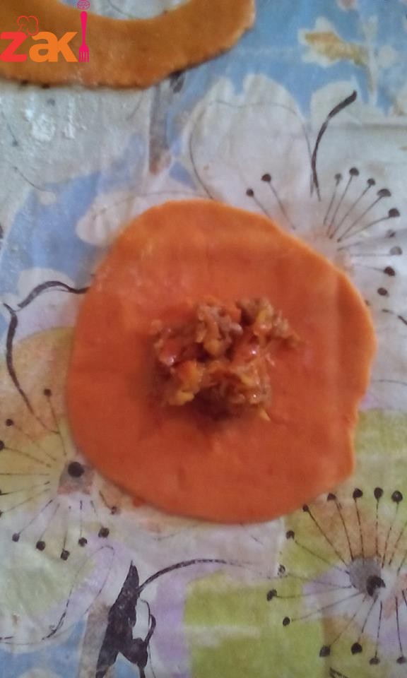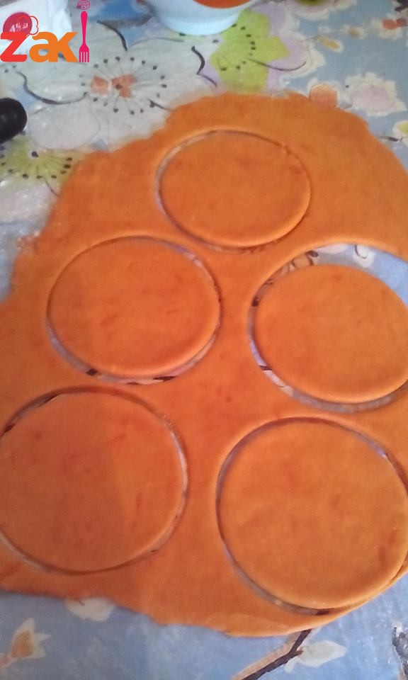 - كما هو موضح في الصورة نحل العجينة بالحلال ونقطعها على شكل دائري ومن بعد نضع الحشو ونغلق عليها