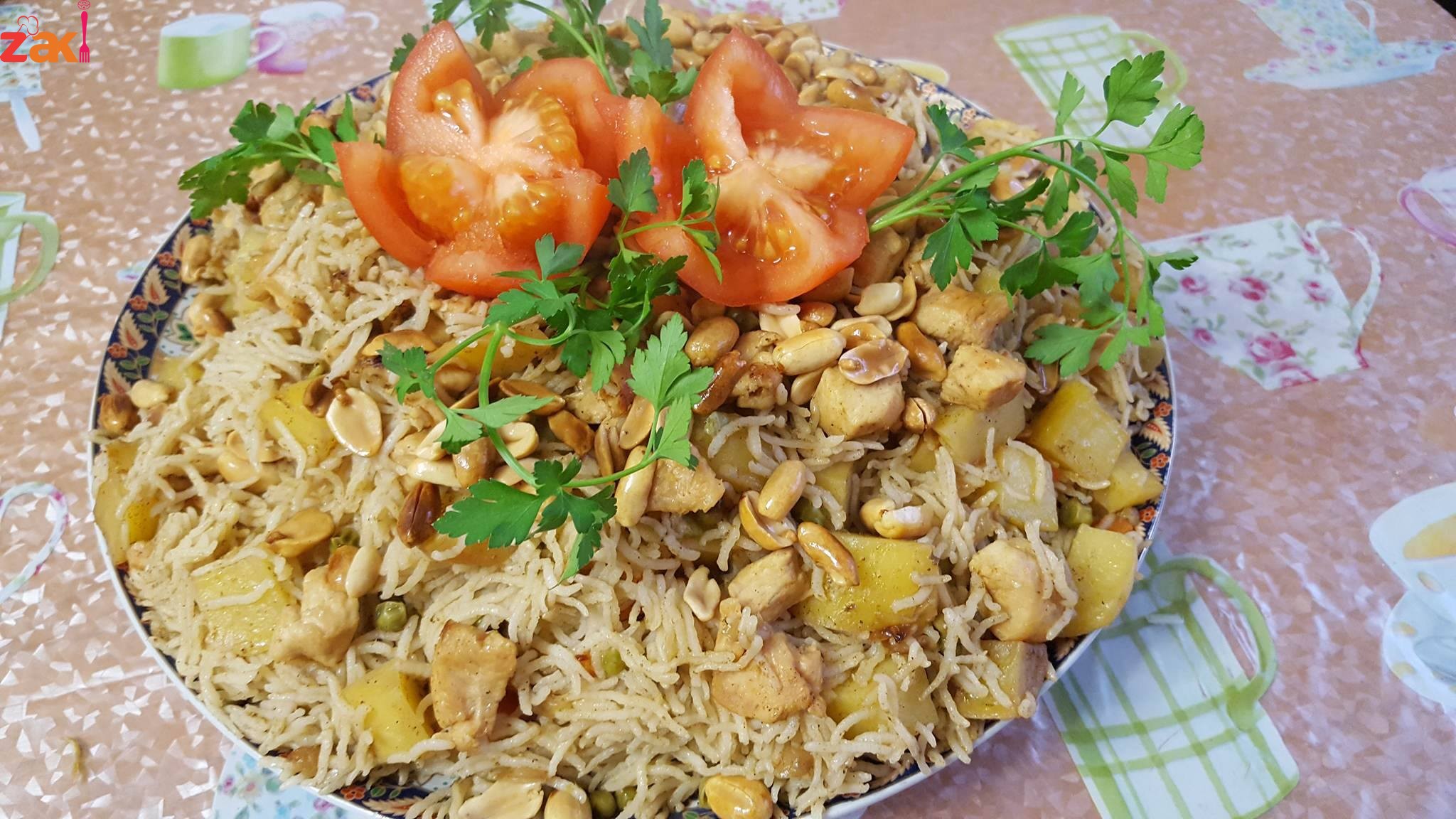 ثم نضيف الجزر مكعبات والبازيلاء حتى يتحمروا نخلطهم بالارز المنقوع مسبقا ثم في طنجرة الطبخ اول شيء نضع الدجاج وفوقه البطاطا ومن ثم الأرز والجزر