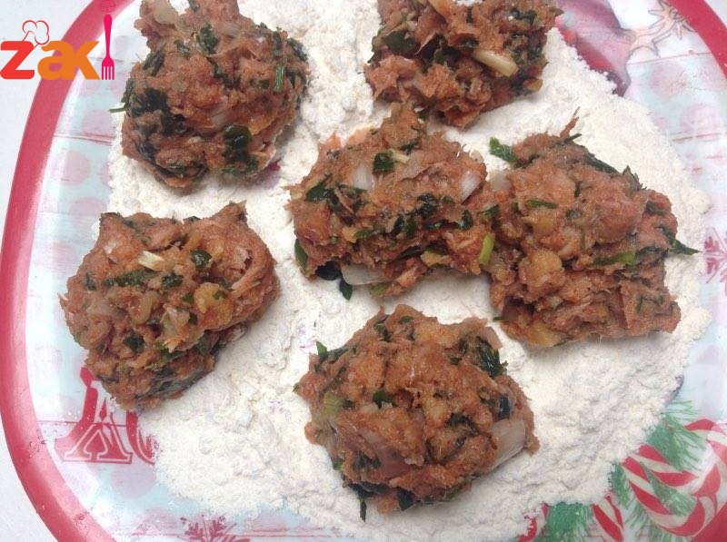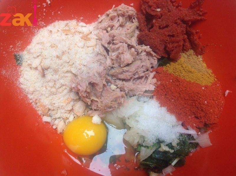 علبة او اثنين تونة بصل مبشور معدنوس مفروم بقسمات بيض ثوم مفروم كمون ملح فلفل احمر ابزار معجون طماطم تكور في الدقيق وتقلي