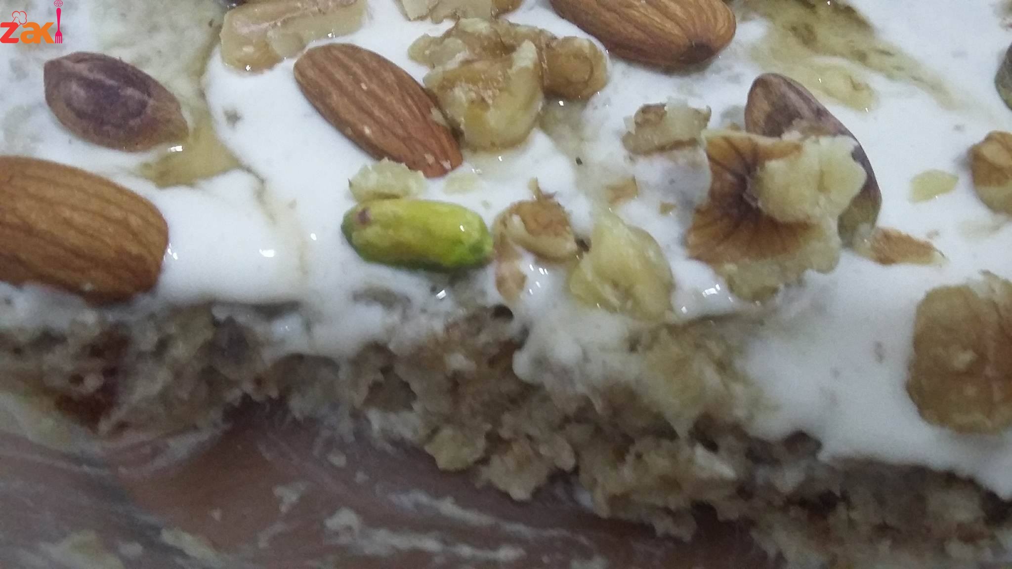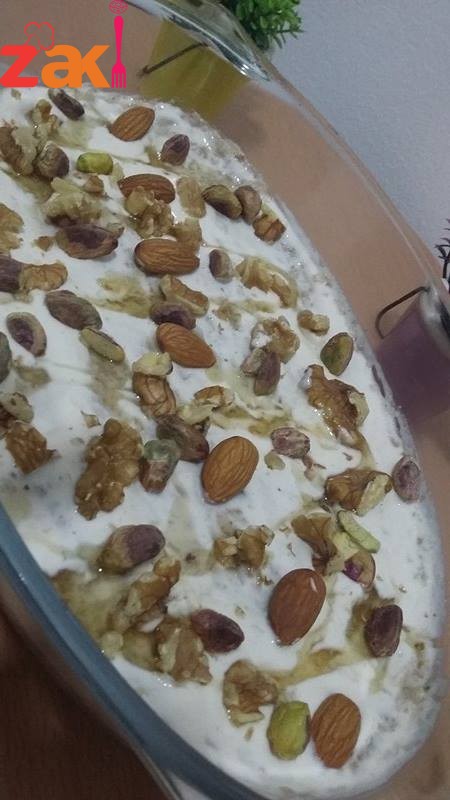 نفرم الخبز على محضرة الطعام ناعم بس مش كتيى نضيف الموز والتمر نصب الخليط بصحن التقديم ويخلط ب تلات ارباع القشطه بس يندمجو نضيف باقي القشطه عالوجه ويزين بالمكسرات والعسل( اختياري)