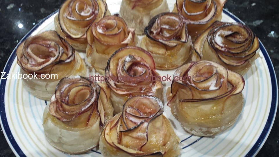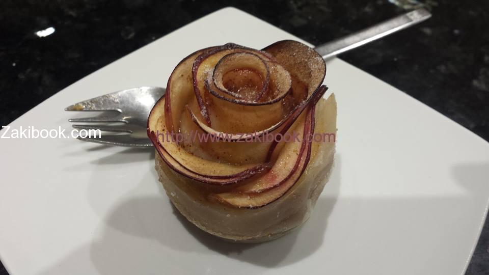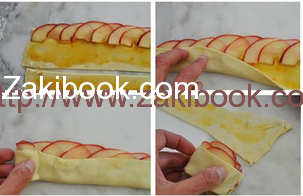 – اطبقي الجزء السفلي من العجين على التفاح ثم لفيها كي تأخذ شكل الوردة.
