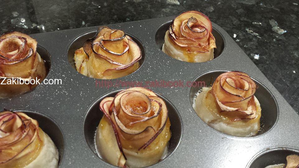 – ضغي وردة التفاح في صينية الكب كيك أو وفي ورق الكب كيك إن لم تتوفر الصينية.