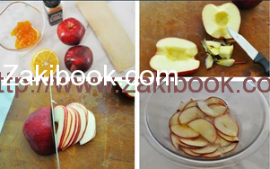 – نقطع التفاح من المنتصف وينظف من الداخل من البذور, ثم يقطع شرائح على شكل أنصاف دوائر رفيعة جداً.