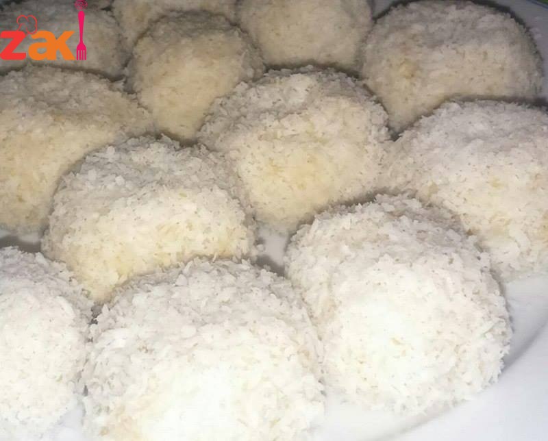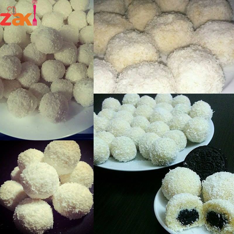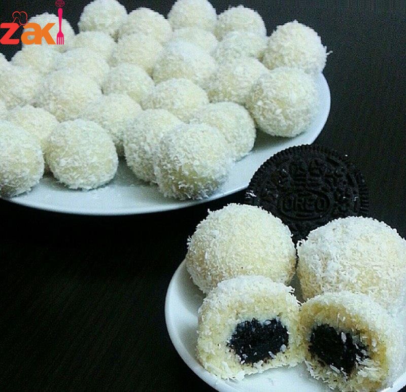 نخرجها ونكورها نفتح فتحه بالاصبع ونضع بسكويت الأوريو ونغلقها وندورها نعيد الكرّة لغايه ما تخلص الكميه نغمّس الكرات في جوز الهند حتى تغطي كلّ كرة بالكامل.نصفّ الكرات فى طبق التقديم ونقدّمها وصحة وهنا