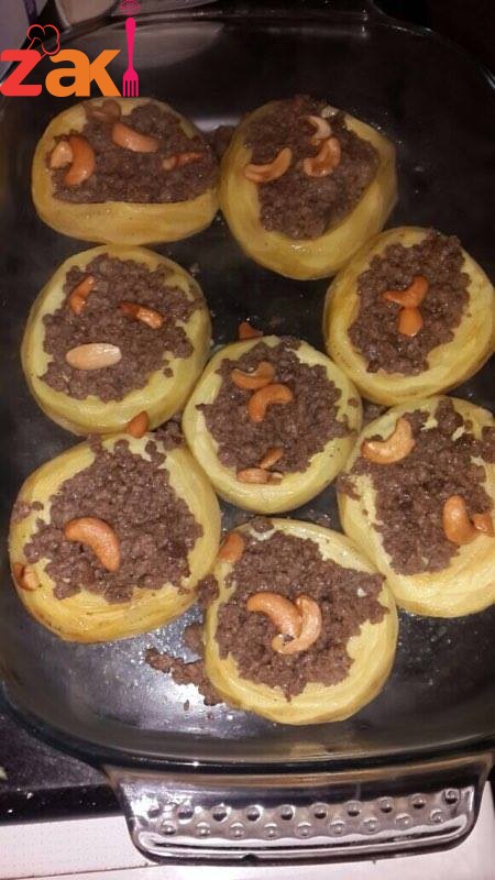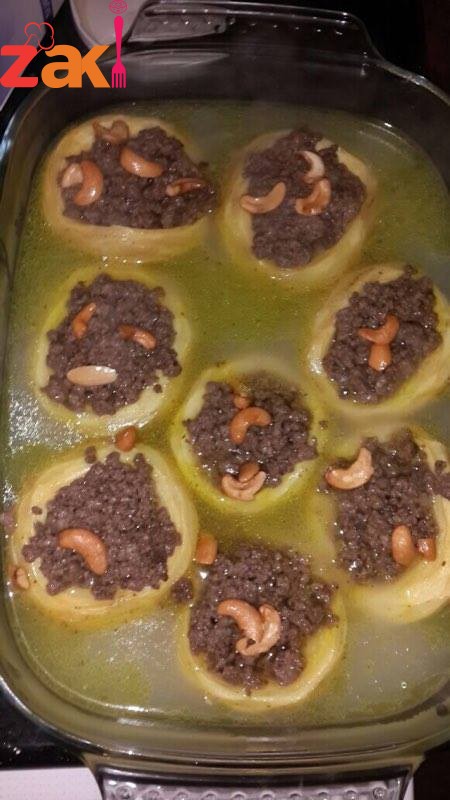 ثم تسلق نقلي اللحمة و نضع البهارات و الملح عليها عندما تستوي الأرضي شوكة تنشل و توضع بالبيركس و توضع اللحمة بداخل كل قرص ثم يوضع من ماء السلق عليها