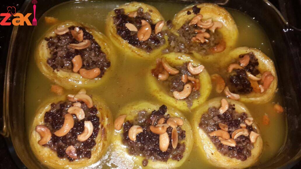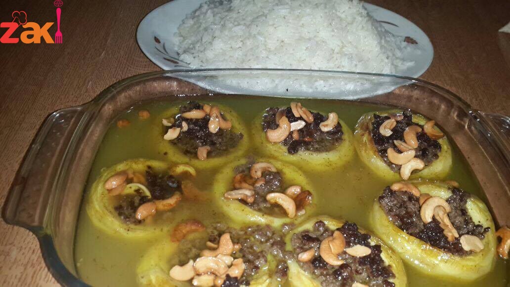 و تحمر بالفرن من فوق و يطبخ ارز ابيض معها بسمتي او امريكي حسب الرغبة و ممكن لمن يحب بعد ان تسلق يقليها ثم يحشيها باللحمة و تزين بالصنوبر و صحة و هنا