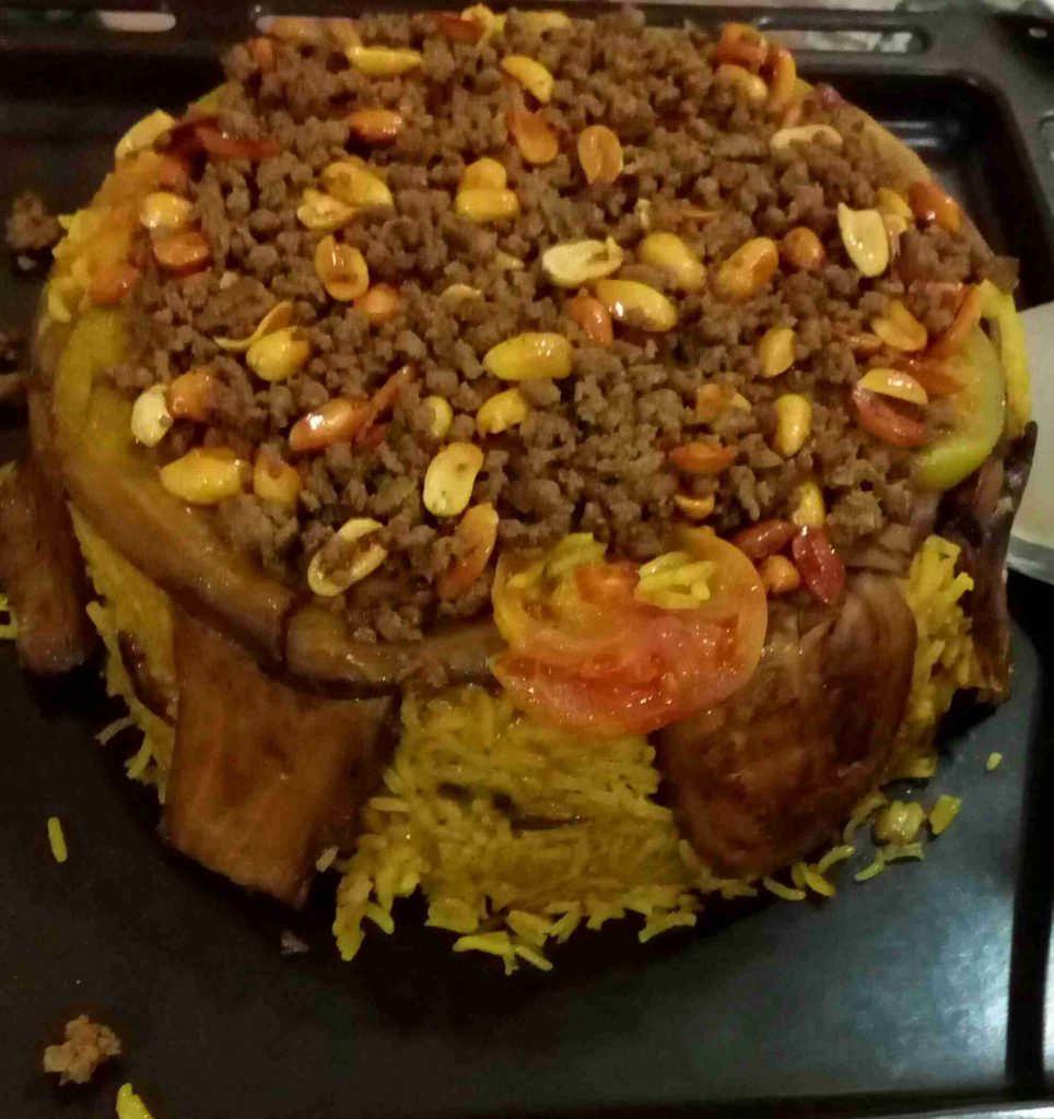منحط عليهون طبق وتقلة لو حبيتي يطلع شكلها هيك متل القالب ومنضيف الماء ومنحطو عنار عالية وبعد ما تخف ميتها شيلي التقلة والطبق وهدي النار وبعد ما تستوي اقلبيها وزينيها باللحمة المحموسة والمكسرات يلي متوفرة عندك.
