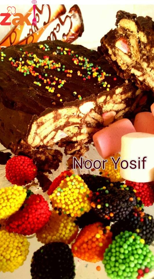 • نضع الخليط في ورقة قصدير أو نايلون ونلفها على شكل اسطوانة أو ممكن وضعها في قالب وتزين بالشوكولا أو السكر البودرة