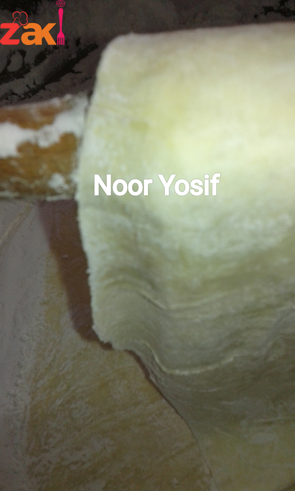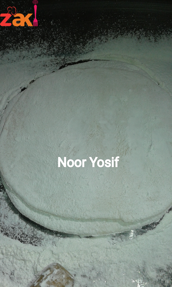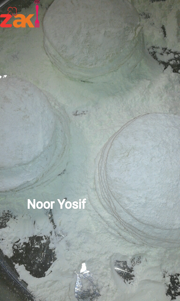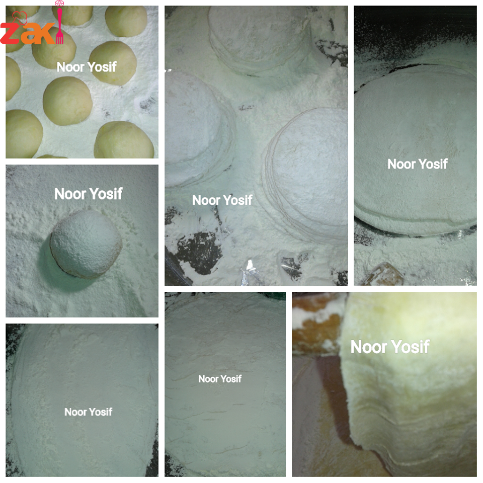 • ثم نرق كل كرة لوحدها فوق النشا حتى نحصل على رغيف متوسط السماكة نضع فوقه طبقة وافرة من النشا ثم رغيف آخر وهكذا حتى نحصل على عشر طبقات ونكرر العملية حتى تنتهي الكمية ثم نقوم بفرد كل مجموعة لوحدها بالشوبك مع رش النشا حتى لا تلتصق الأرغفة ببعض وهكذا حتى نحصل على طبقات رقيقة جدا