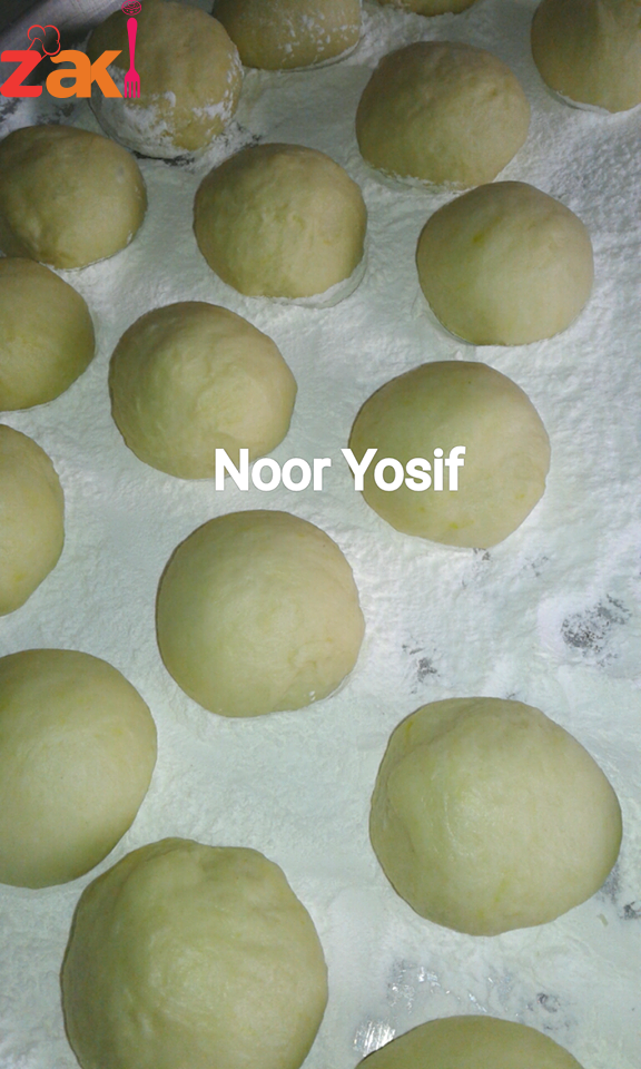 • نخلط كيلو طحين مع رشة ملح صغيرة وفنجان صغير زيت وفنجان صغير سمنة مذابة ونفرك المكونات جيدا ثم نضيف ماء بارد تدريجيا للحصول على عجينة متماسكة نتركها ترتاح نصف ساعة ثم نقطعها كرات بحجم حبة الجوز ونتركها نصف ساعة لترتاح فوق سطح مرشوش بالنشا