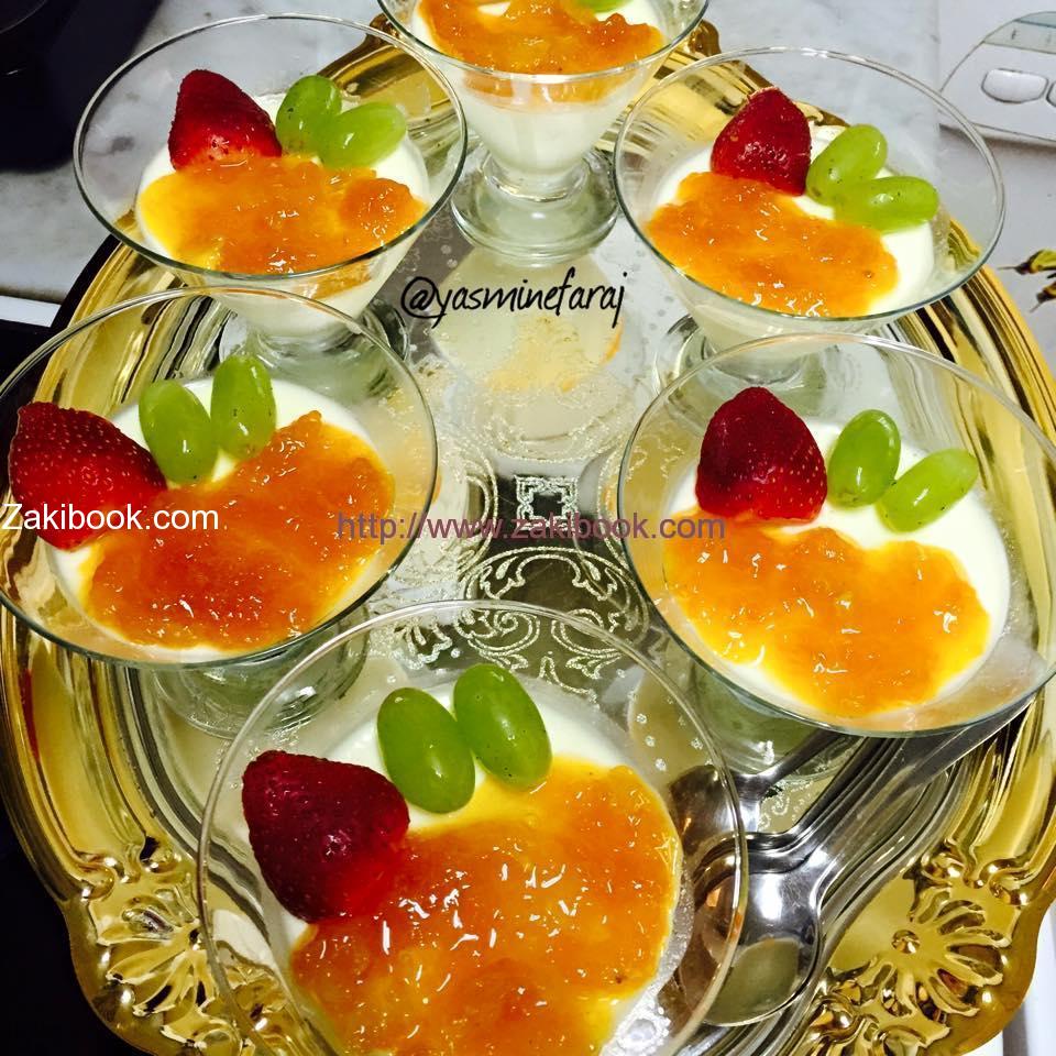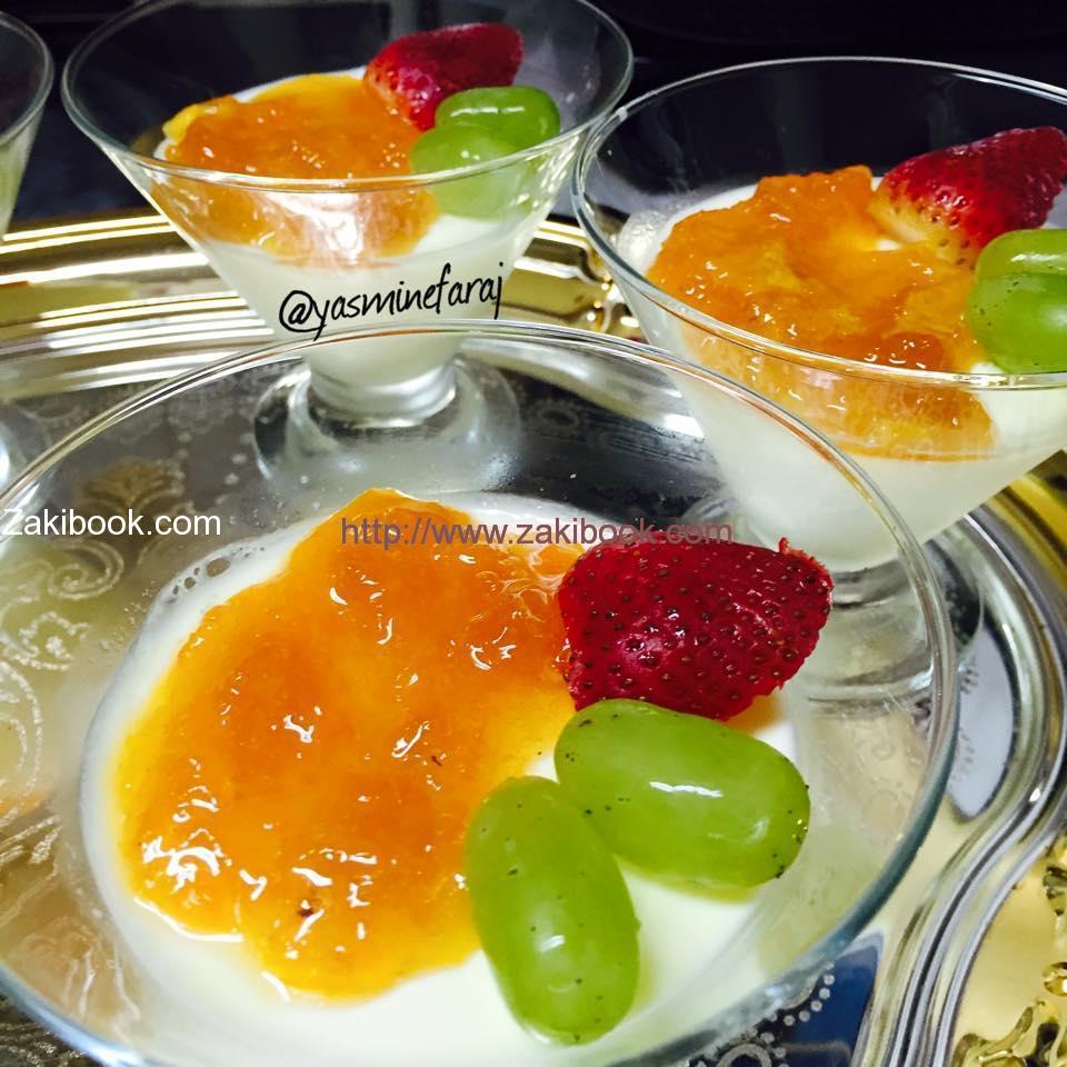 – بعدين نزينها باي نوع فواكه بنحب او مربى قبل التقديم انا عملت مربى برتقال حطيت منو شوي لانو البانا كوتا مو كتير حلوة مع فريز و عنب اخضر.