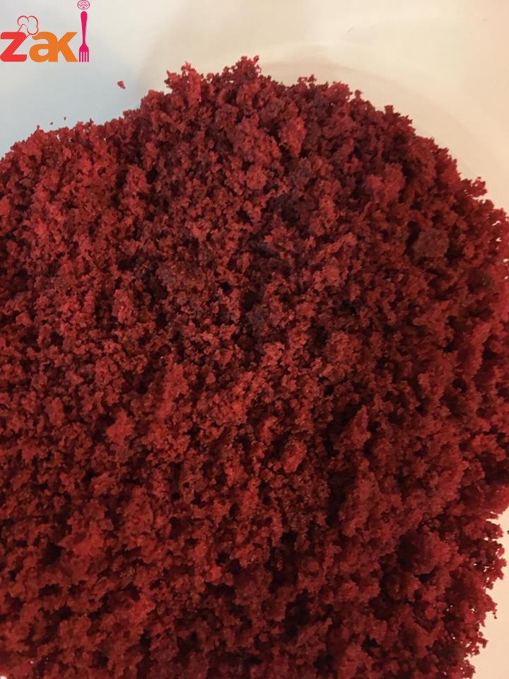 نخفق البيض والسكر والفانيليا على سرعة عالية حتى يتضاعف حجم البيض ثلاثة مرات ثم نضيف الملون ونخفق ننخل الطحين والباكنغ بودر والكاكاو ويضاف للخليط