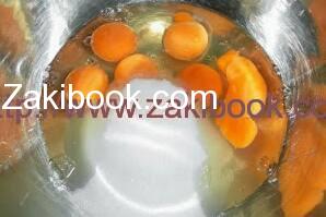 – في اناء نضرب بالخلاط الكهربائي البيض و السكر و القليل من الملح و الفانيلا.