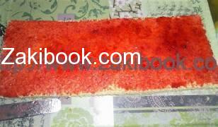– تسقى الكيك بسيرو او شراب ( كأس سكر و 2 كؤوس ماء نضعهم فوق النار و نستعملهم باردين لسقي او تشريب الكيك ) تقطيع الكيك على شكل مستطيل نضع مربى الفريز ممكن اضافة القليل من الماء له لتخفيف المربى.