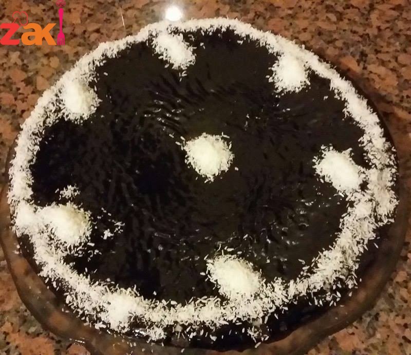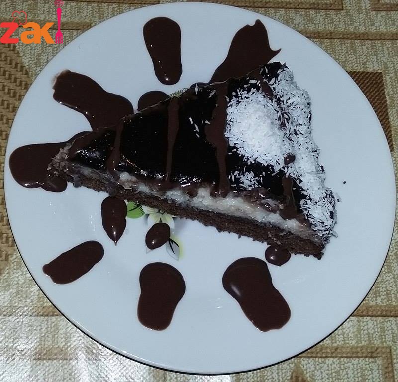 نضع طبقة جوز الهند فوق الكيك ونضع صوص الشوكولا وفورا للثلاجة تقريبا حوالي ساعتين