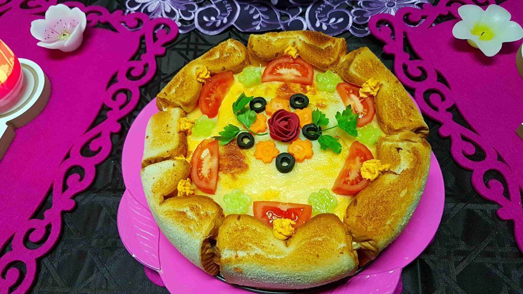 دي تورتة التوست..بس دي في الفرن…يعني جبت توست..ورصيت على جوانب صينيه تشيز كيك…ورصيت طبقه في قاع الصينيه..ةحطيت جبنه موتزرلا وشيدر ولنشون او سوسيس..او اي حشوة..وزيتون…وجبنه مثلثات…وغطيت بطبقه تانيه من التوست وكررت الحشوه مع تزويد الجبن لانها هتسيح وتبقى تحفه..ونهيت بطبقة توست…ورشيت موتزارلا..وتنيت اطراف التوست اللي فوق…ةحطيتها في الفرن …تحفه وتتاكل سخنه…